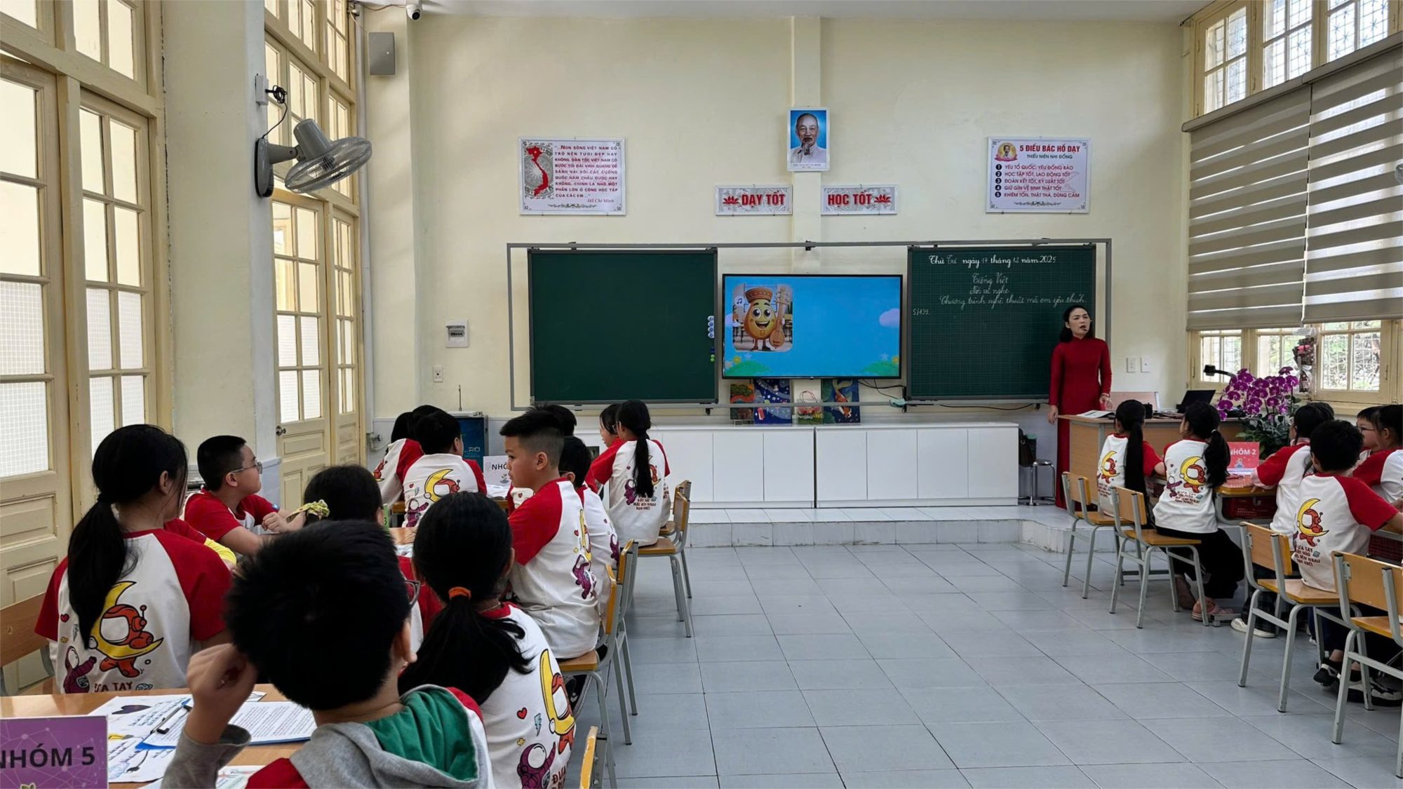 Thực hiện kế hoạch chuyên môn của nhà trường, tổ chuyên môn khối 5 đã tổ chức chuyên đề “Ứng dụng phương pháp dạy học tích cực và công nghệ AI nhằm phát huy năng lực giao tiếp cho học sinh qua môn Tiếng Việt” thông qua tiết dạy minh họa Nói và nghe: Chương trình nghệ thuật em yêu thích (Bài 28 – Chủ đề Nghệ thuật muôn màu) do cô giáo Đào Thị Thanh Huyền và các em học sinh lớp 5A7 thực hiện.