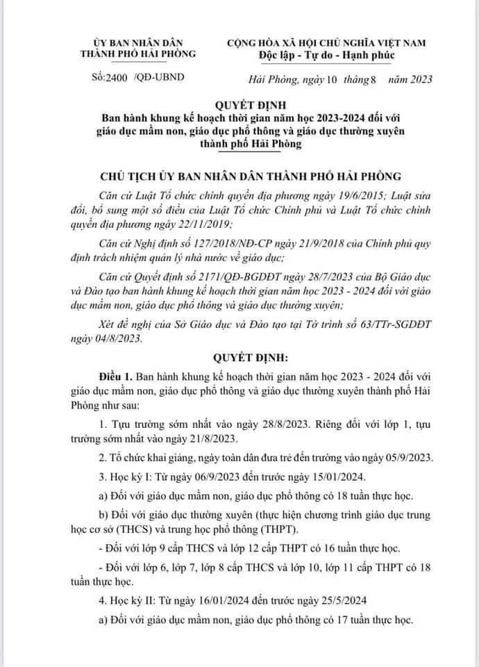 Quyết định Ban hành khung kế hoạch thời gian năm học 2023 - 2024 đối với giáo dục mầm non, giáo dục phổ thông và giáo dục thường xuyên thành phố Hải Phòng