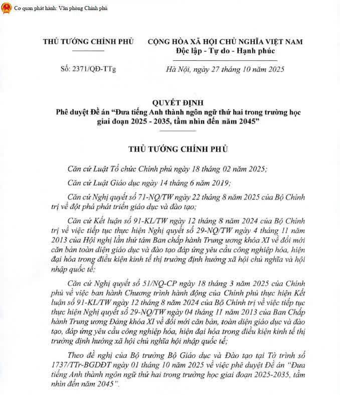 Ngày 27/10/2025, Thủ tướng Chính phủ đã ký Quyết định phê duyệt Đề án “Đưa tiếng Anh thành ngôn ngữ thứ hai trong trường học giai đoạn 2025–2035, tầm nhìn đến năm 2045”.