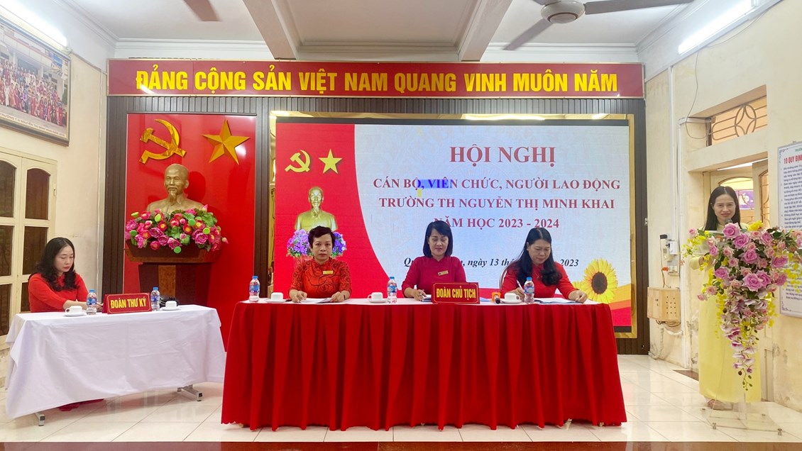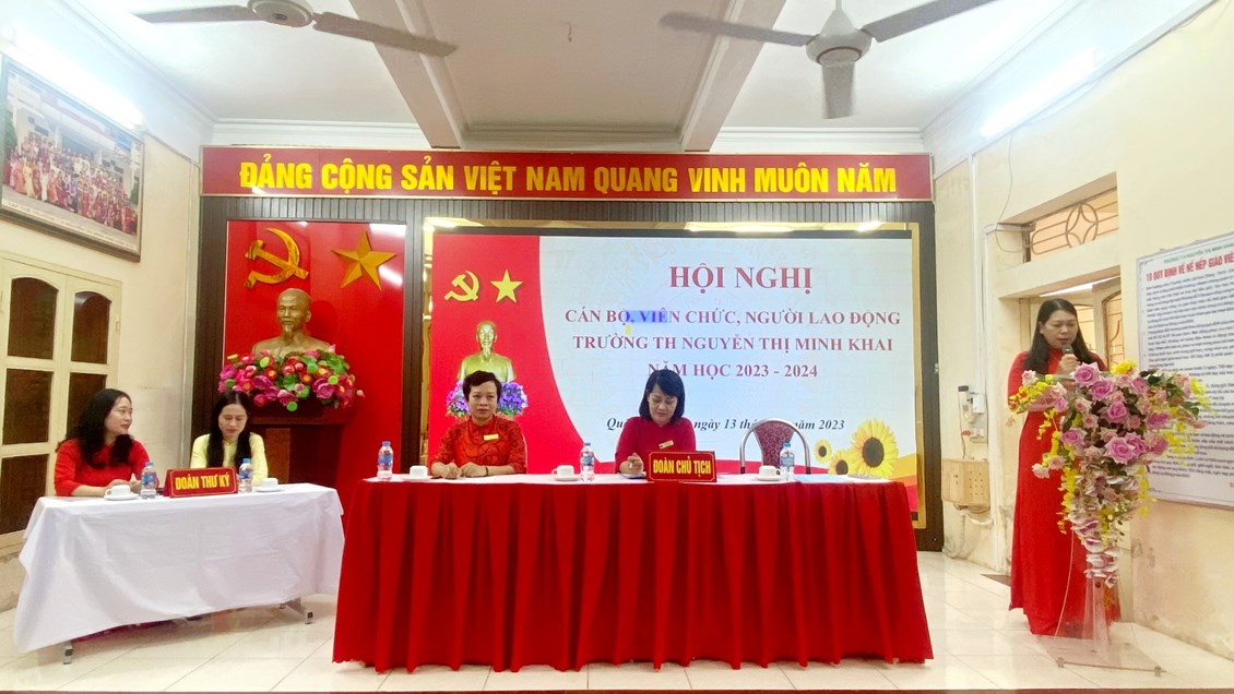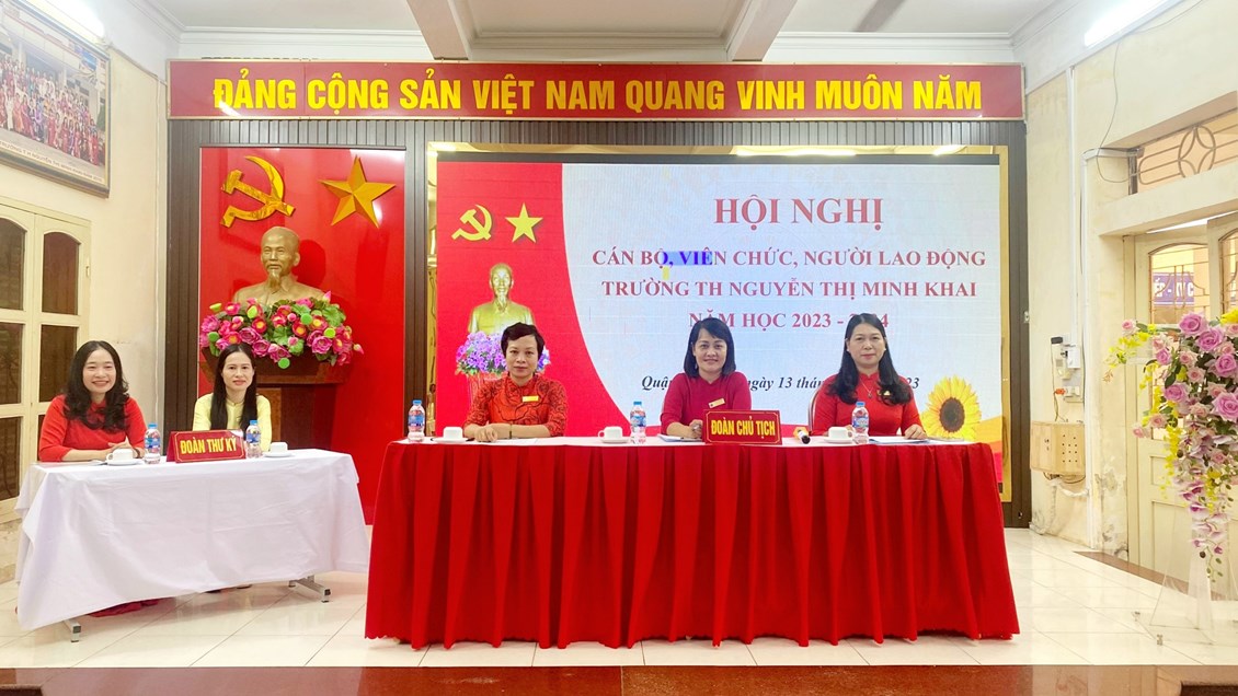 Hội nghị Cán bộ, viên chức, người lao động trường Tiểu học Nguyễn Thị Minh Khai được tổ chức một cách nghiêm túc, thành công với sự phối hợp của Cấp ủy, Ban giám hiệu và Công đoàn nhà trường.