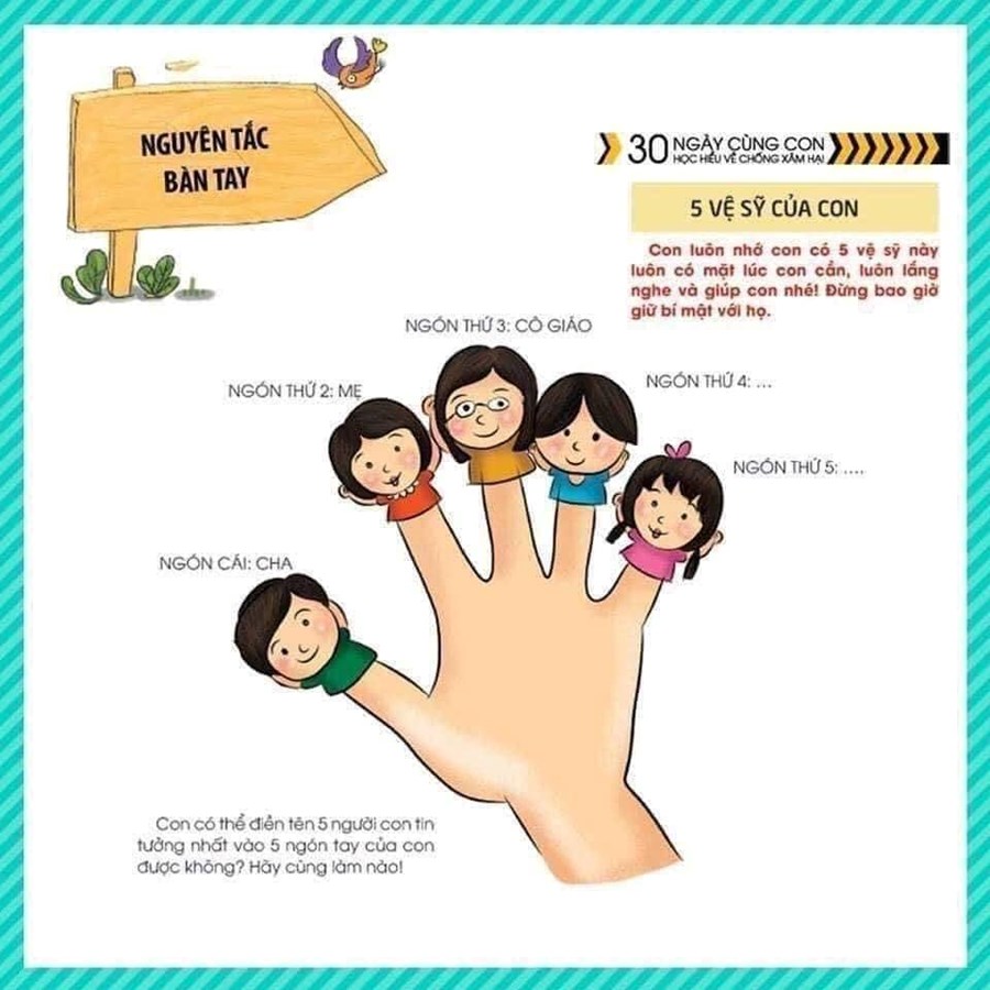 Cha mẹ cần dạy bé biết quy tắc bàn tay giao tiếp (mỗi ngón tay là 1 quy tắc) sau đây: