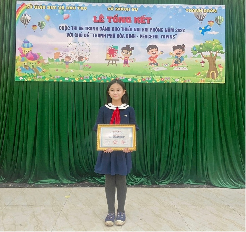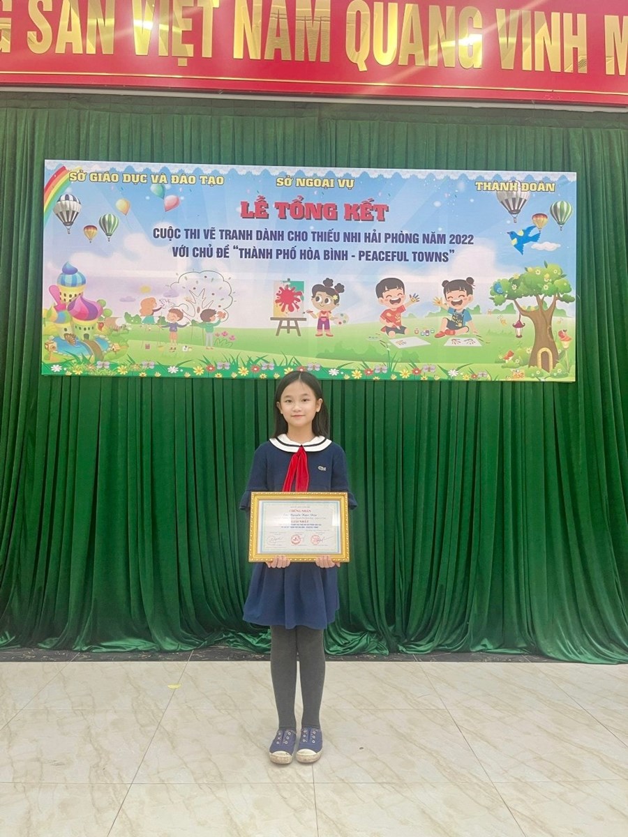 Trong cuộc thi vẽ tranh dành cho thiếu nhi Hải Phòng năm 2022 với chủ đề “Thành phố hoà bình” - Peaceful towns do Sở giáo dục và đào tạo kết hợp với Sở ngoại vụ cùng Thành Đoàn Hải Phòng tổ chức, trường TH Minh Khai đạt 01 giải Nhất tranh của bạn Nguyễn Ngọc Diệp - Học sinh lớp 5A9.