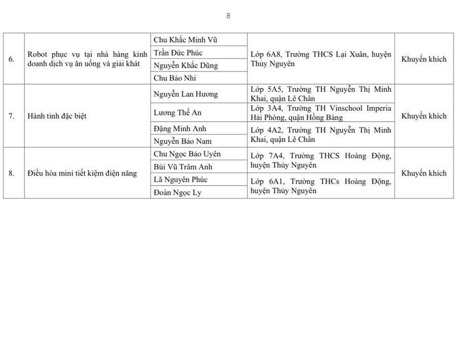 khích: Sản phẩm: Hành tinh đặc biệt, thuộc lĩnh vực Đồ dùng gia đình và đồ chơi trẻ em, của các em: Nguyễn Lan Hương lớp 5A5, Lê Đức Dũng lớp 4A2, Đặng Minh Anh lớp 4A2, Nguyễn Bảo Nam lớp 4A2.